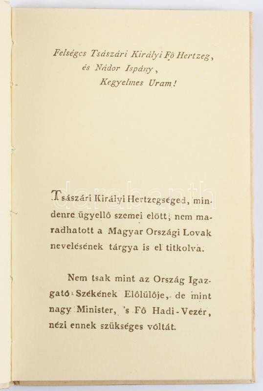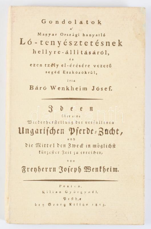 Wenkheim József: Gondolatok a' Magyar Országi hanyatló Ló-tenyésztetésnek hellyre-állitásáról, és ezen tzély el-érésére vezető segéd Eszközökrűl. Bp.,(1988),Agrárinformációs Vállalat. Reprint. Kiadói kartonált papírkötés, kopott, foltos borítóval.