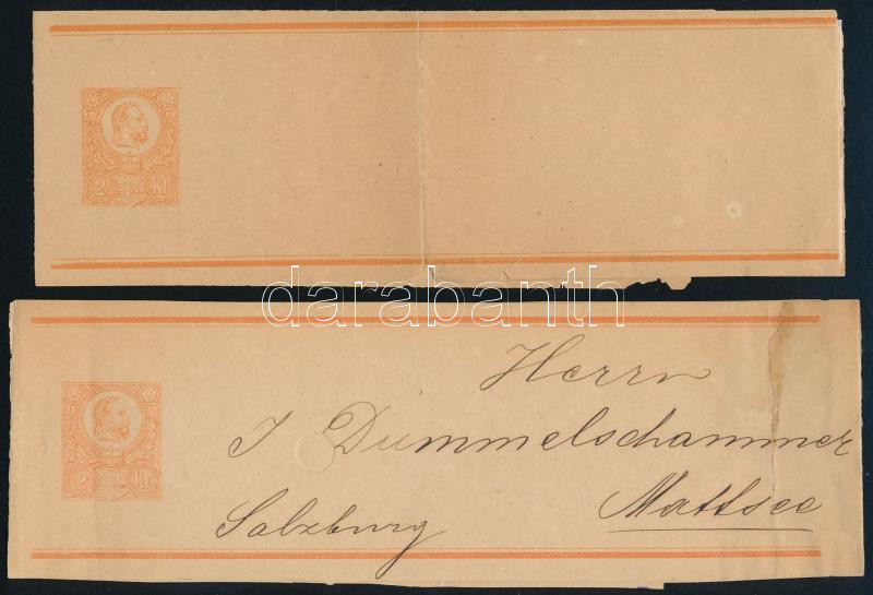 1872 2 db 2kr díjjegyes címszalag, az egyik használatlan