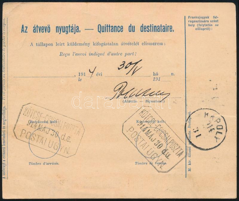 1914 Csomagszállító "KÖTCSE-CSICSALPUSZTA" postaügynökségi bélyegzéssel