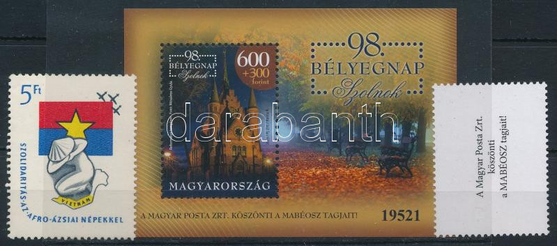 2025 Bélyegnap (98.) - Szolnok bélyeg a hátoldalán és a blokk előoldalán a Magyar Posta Zrt. köszönti a MABÉOSZ tagjait! felirattal + 1 db Szolidaritás az afro-ázsiai népekkel 5Ft bélyeg