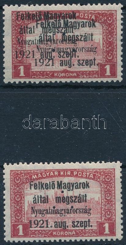 Nyugat-Magyarország I. 1921 Parlament 1K dupla felülnyomattal (a katalógusban ismeretlen), hármaslyukasztással + támpéldány, mindkét bélyeg Bodor vizsgálójellel