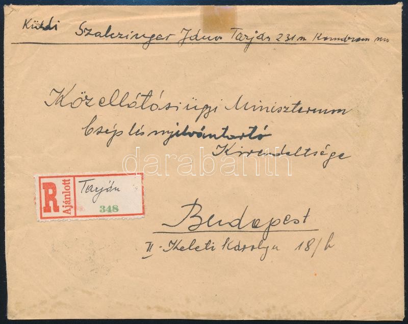 1946 Ajánlott levél 50 ezer AP hatostömb bérmentesítéssel és szükségragjeggyel Tarjánból Budapestre / Mi 936 block of 6 on registered cover with auxiliary label