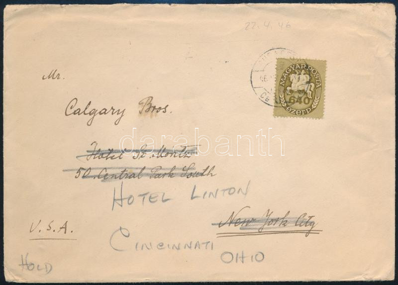 1946 Levél New Yorkba, majd továbbküldve Ohioba Lovasfutár 640 ezer P bérmentesítéssel, a levél hátoldalán további 3 db bélyeggel (bélyegzés nélkül) / Cover to New York, redirectet to Ohio with 640.000P franking (3 stamps on the backside without postmark)