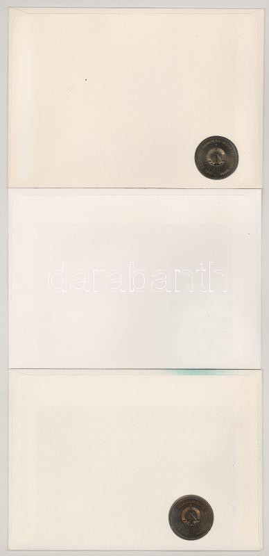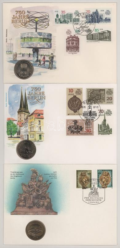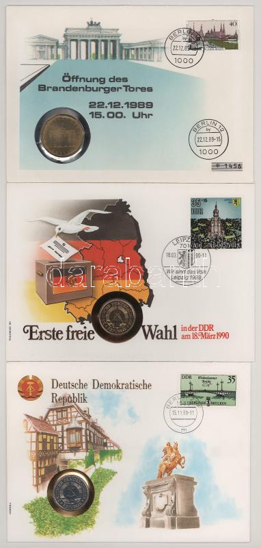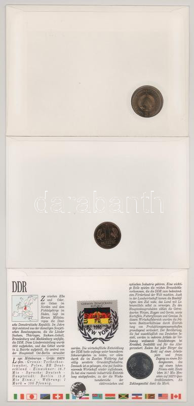 Német Demokratikus Köztársaság 6xklf érmés boríték tétel, bélyeggel, bélyegzéssel és német nyelvű leírással, benne: 1971. 5M Cu-Ni "Brandenburgi kapu" + 1982. 1M Al + 1987. 1M Al + 1987A 5M Cu-Ni "Alexanderplatz" + 1987A 5M Cu-Ni "Nikolaiviertel" + 1990A 5M Cu-Ni "Zeughaus Múzeum" T:UNC,AU