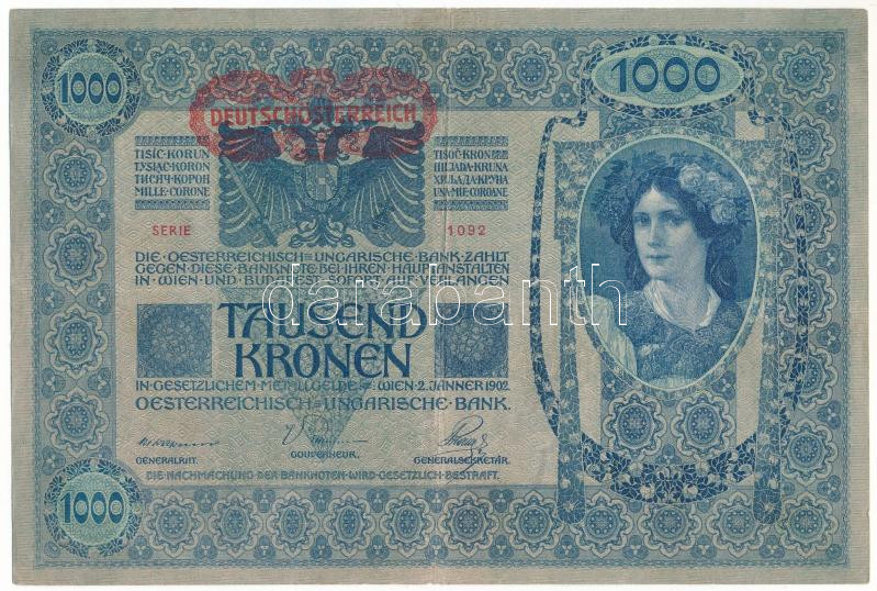 1902. 1000K vízszintes, piros "DEUTSCHÖSTERREICH" felülbélyegzéssel, "1092 15522" T:F
