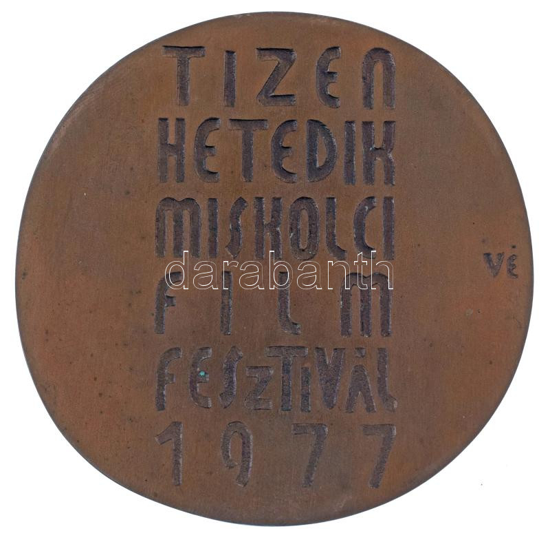 1977. "Tizenhetedik Miskolci Filmfesztivál 1977" kétoldalas, öntött bronz emlékplakett. Szign.: VE (88mm) T:AU