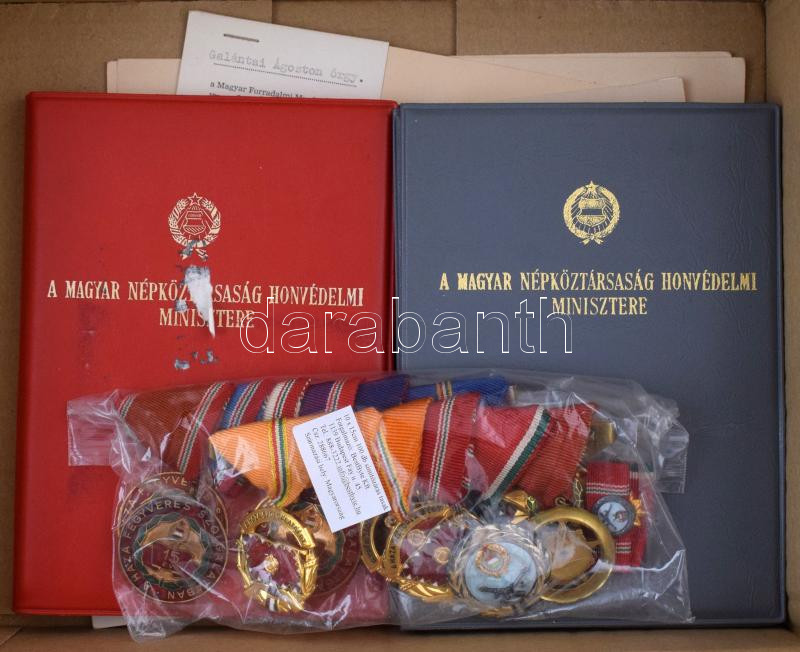 A Magyar Népköztársaság 12db-os kitüntetés sora két részletben, ismétlődő darabokkal, közte: 1954. "Kiváló Szolgálatért Érdemérem", 1956. "Árvízvédelemért Emlékérem", 1957. "Szolgálati Érdemérem" szalagsávval, 1956. "A Haza Szolgálatáért Emlékérem" arany fokozata (3x), 1956. "A Haza Szolgálatáért Emlékérem" ezüst fokozata, 1970. "Felszabadulási Jubileumi Emlékérem" szalagsávval. Több kitüntetéshez adományozói okirattal illetve viselői igazolvánnyal T:vegyes