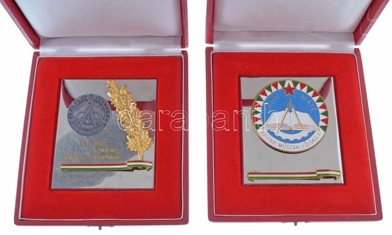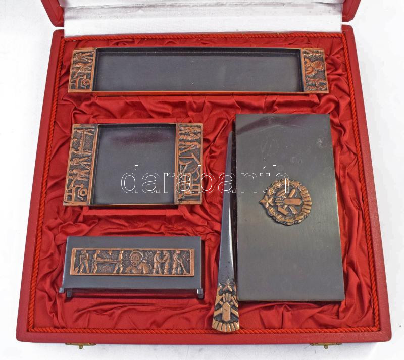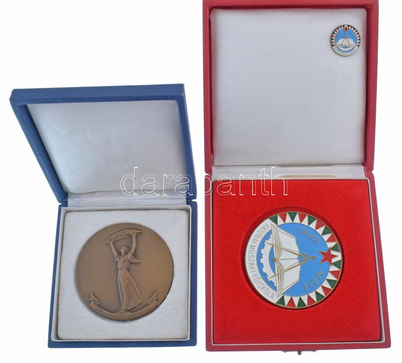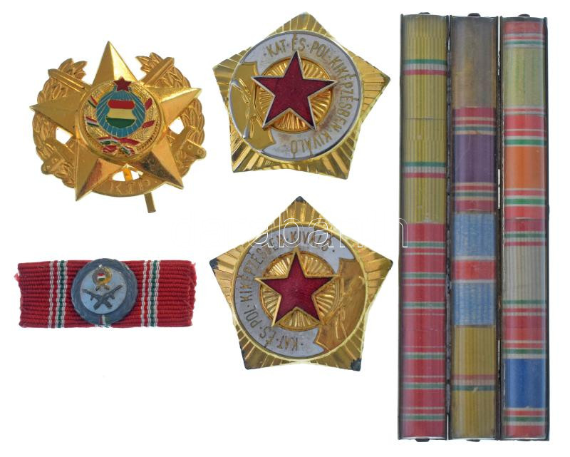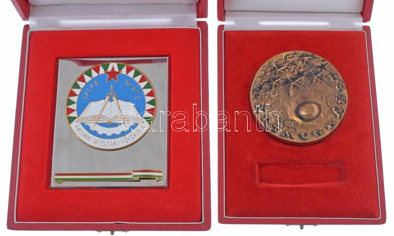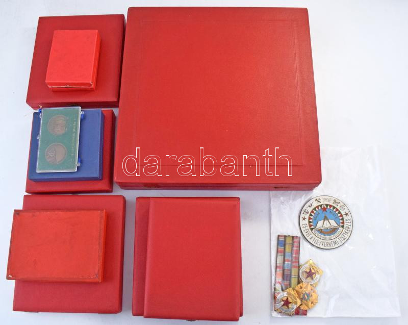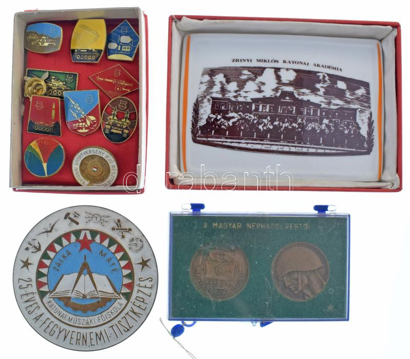 Tartalmas Magyar Néphadsereg tétel, benne: Öt darab Zalka Máté Katonai Főiskola zománcfestett plakett (egy kivételével mind eredeti tokban), Pártmunkáért bronz emlékérem, "Zrínyi Miklós Katonai Akadémia" festett Hollóházi porcelán plakett, Szabadság szobrot ábrázoló kétoldalas bronz emlékérem "Zalka Máté" címeres tokban, "Magyar Néphadseregtől" műanyag tokos két darab bronz emlékérem, 14db jelvény (többségében fegyvernemi, valamint Katonai és Politikai Képzésben Kiváló jelvények), műanyag-fém szalagsáv összeállítás + zománcozott miniatűr szalagsáv; díszdobozos asztali kellék (levélbontó, cigarettakínáló, ceruza/tolltartó tálca)