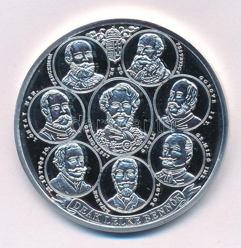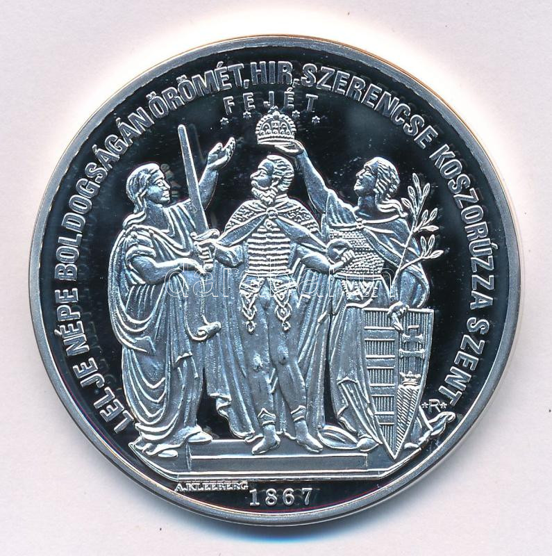 1867. "I. Ferenc József budai koronázására" ezüstözött fém emlékérem "R" jelzésű replika. "LELJE NÉPE BOLDOGSÁGÁN ÖRÖMET, HÍR, SZERENCSE KOSZORÚZZA SZENT FEJÉT / DEÁK EMLÉKE BENNÖK". Szign.: August Kleeberg (46mm) T:PP