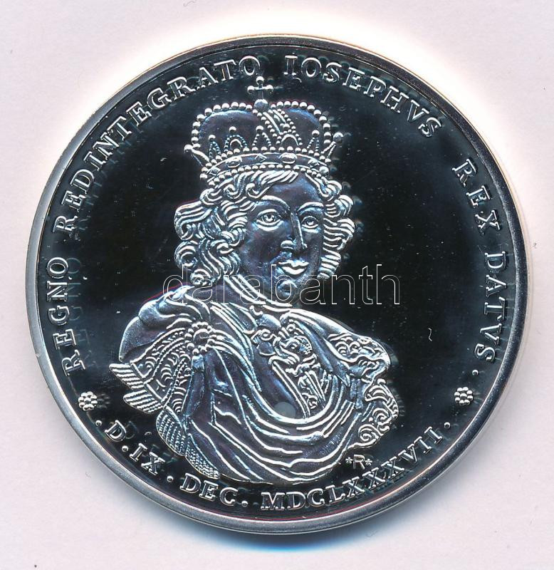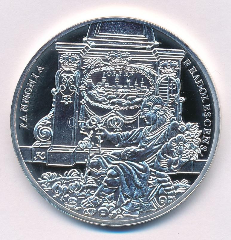 DN "REGNO REDINTEGRATO IOSEPHUS REX DATUS - D.IX.DEC.MDCLXXXVII / PANNONIA READOLESCENS" 1687-es emlékérem ezüstözött fém utánverete "R" (replika) jelzéssel kapszulában (46mm) T:PP