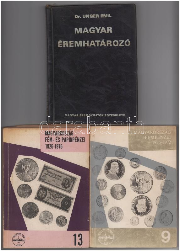 Vegyes 3db-os irodalom tétel, benne: Dr. Unger Emil: Magyar éremhatározó I. kötet. Budapest, MÉE, 1974; Leányfalusi Károly - Nagy Ádám: Magyarország Fémpénzei 1926-1972- A Budapesti Állami Pénzverő pénzei . Magyar Éremgyűjtők Egyesülete, Budapest, 1974; Leányfalusi Károly - Nagy Ádám: Magyarország fém- és papírpénzei 1926-1976. MÉE, Budapest, 1977. - II. Javított és bővített kiadás. Használt állapotú kötetek