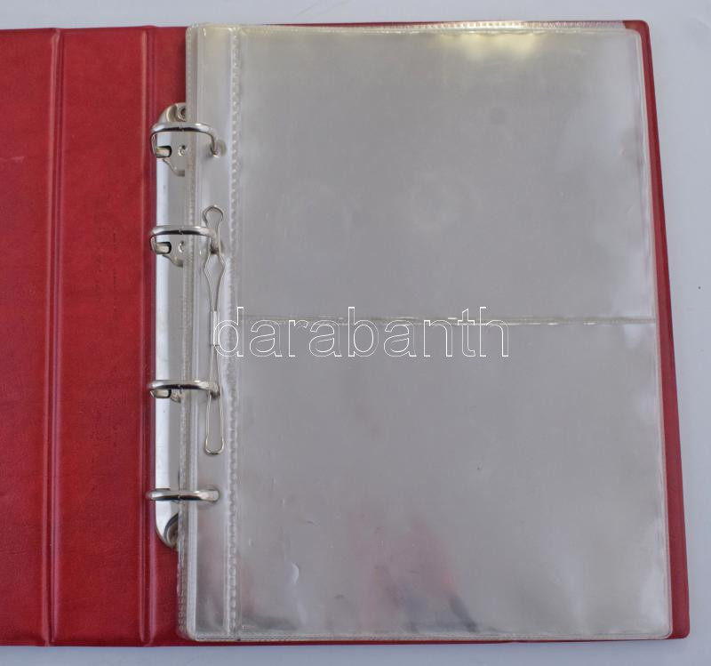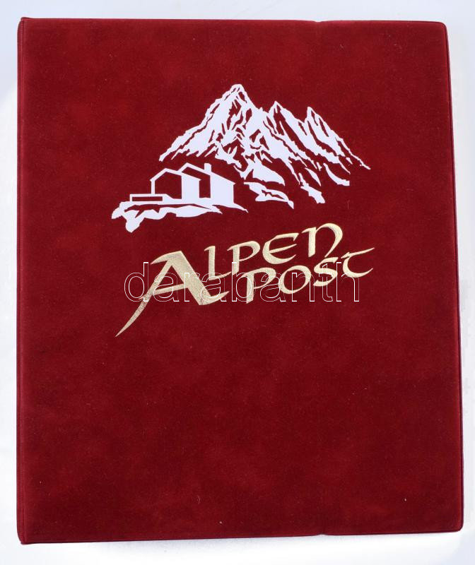 "Alpen Post" piros, plüssborítású, négygyűrűs album, 14db kettesosztású berakólappal. Használt, de jó állapotban