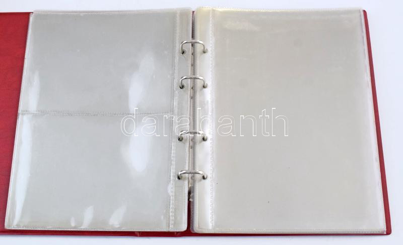 "Münz-Briefe aus aller Welt" piros, plüssborítású, négygyűrűs album, 7db kettes osztású és 25db osztás nélküli berakólappal. Használt, de jó állapotban