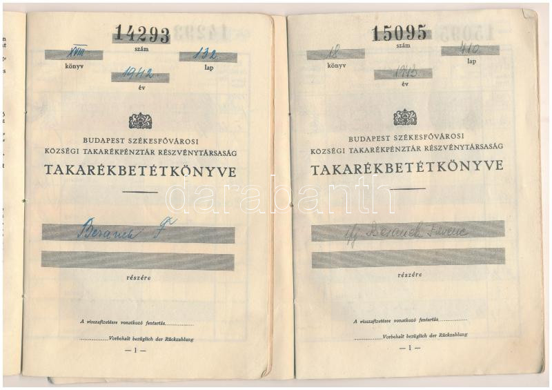 1942-1944. "Budapest Székesfővárosi Községi Takarékpénztár Részvénytársaság" takarékbetétkönyve, bejegyzésekkel (2x)