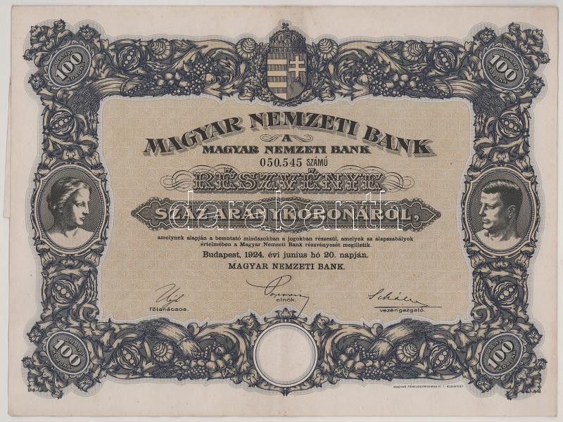 Hungary 1924. "Magyar Nemzeti Bank (Hungarian National Bank)" Hungarian National Bank share about 100 Korona "050.545" with embossed stamp on watermarked paper C:XF