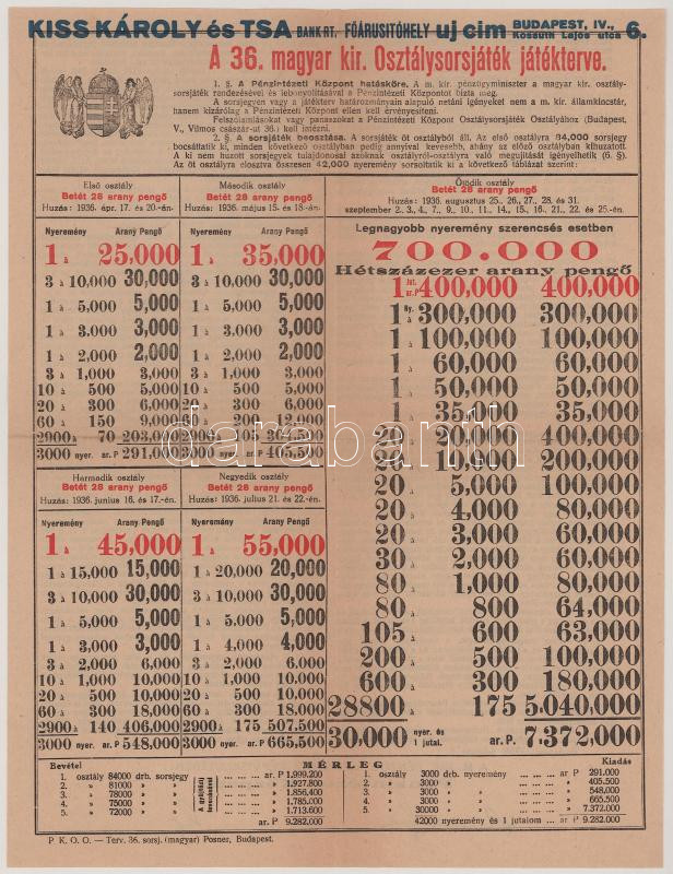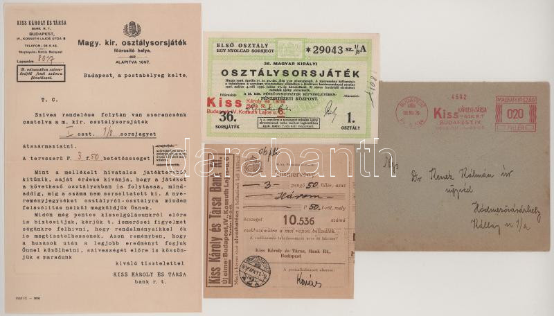 1936. "36. Magyar Királyi Osztálysorsjáték" 1. osztály egynyolcad sorsjegye "A", "Kiss Károly és Társa" bélyegzővel, felbélyegzett borítékkal, a cég levelével, játéktervével és tájékoztatójával, valamint a befizetésről szóló elismervénnyel T:AU,XF