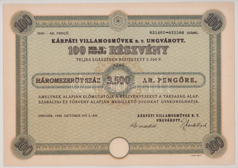 Hungary / Ungvár 1940. "Carpathian Electric Company in Ungvár" 100 shares in one, each about 35 Pengő, total value 3500 Pengő, with embossed stamp C:AU