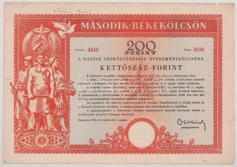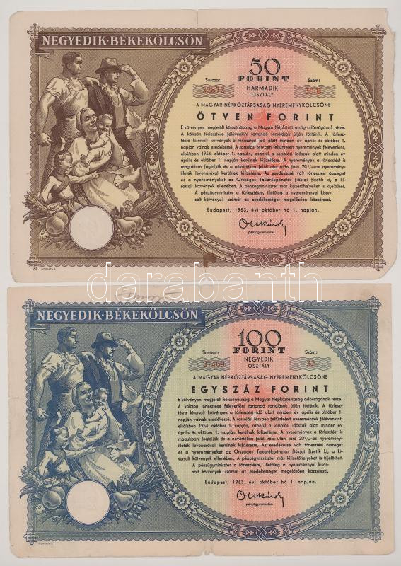 1951. Budapest "Második Békekölcsön" 200Ft-ról + 1953. Budapest "Negyedik Békekölcsön - III. és IV. osztály" sorsjegy 50Ft-ról és 100Ft-ról, szárazpecséttel T:VG