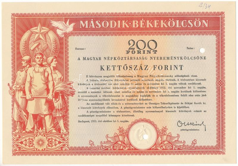 1951. Budapest "Második Békekölcsön - a Magyar Népköztársaság nyereménykölcsöne" 200Ft értékben, sorszám nélkül, szárazpecséttel, lyukasztásokkal érvénytelenítve T:AU nagyobb sarokhajlás, jobb felső sarokban kézírásos tintával írt kódszám