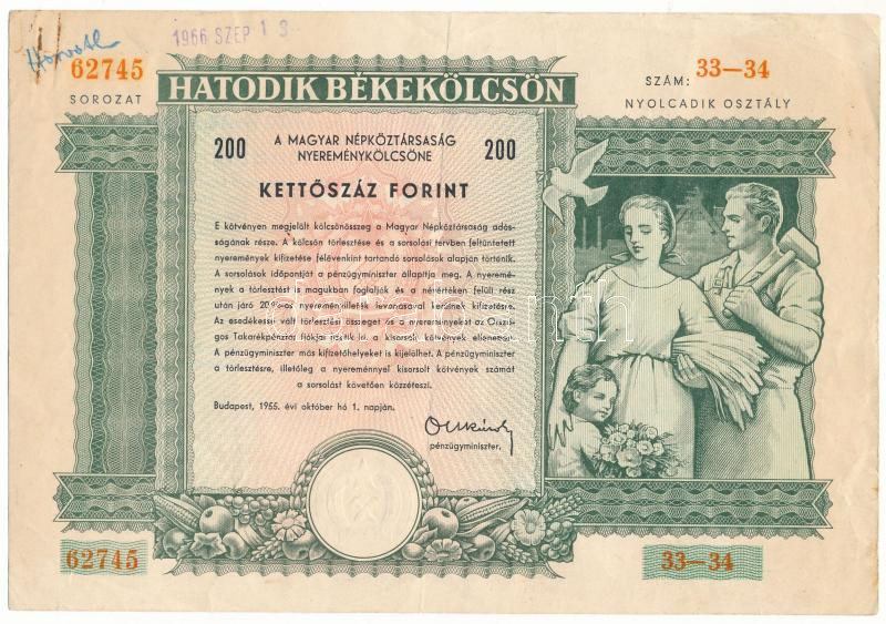 1955. Budapest "Hatodik Békekölcsön - a Magyar Népköztársaság nyereménykölcsöne" 200Ft értékben, szárazpecséttel, "33-34 62745" T:F