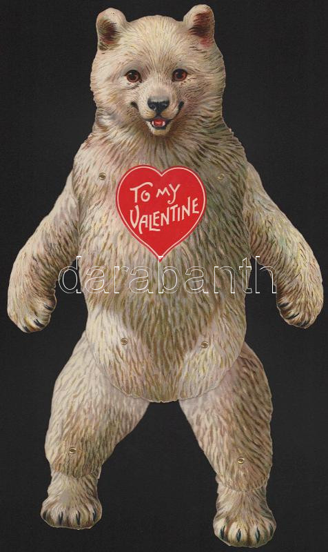 "To my Valentine" litho mozgatható végtagú papírmedve, kiadja: Raphael Tuck & Sons Ltd., h: 31 cm