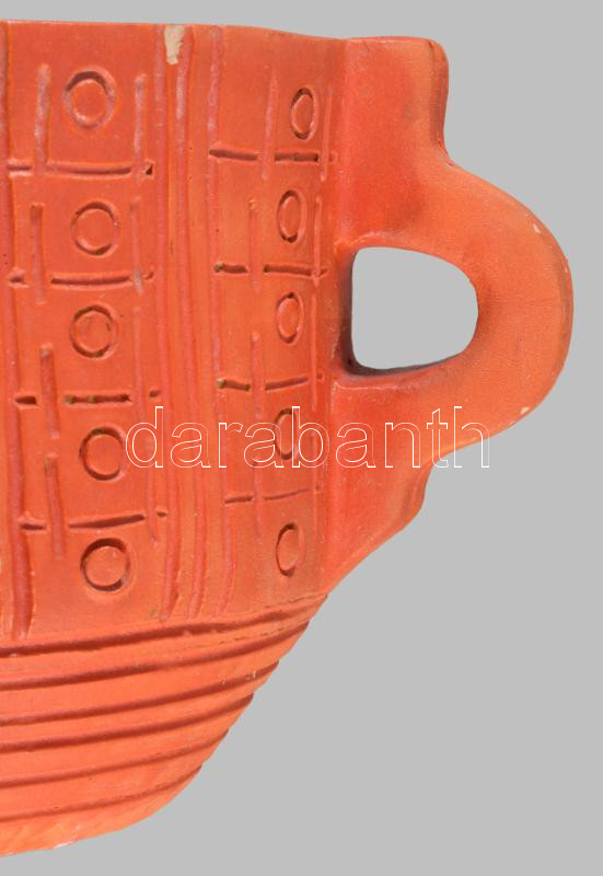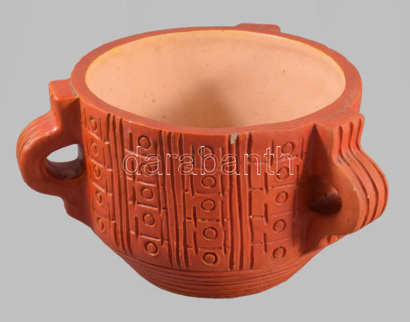 Háromfülű vörös kaspó, kopással, d: 17 cm, m: 12 cm