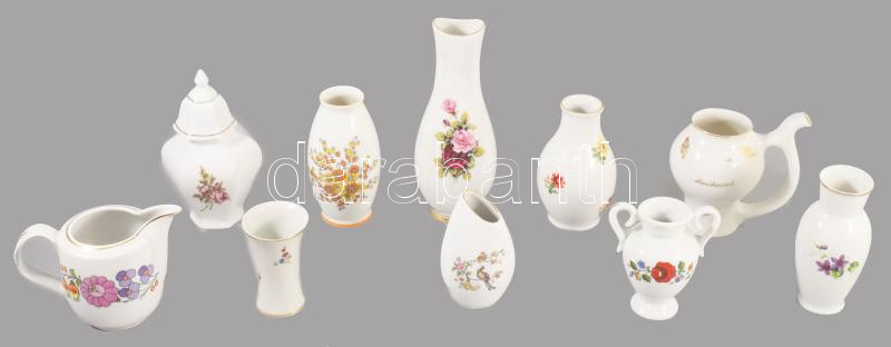 10 darab magyar váza, kiöntő, kúrapohár, közte Kalocsai, m: 17 cm alatt