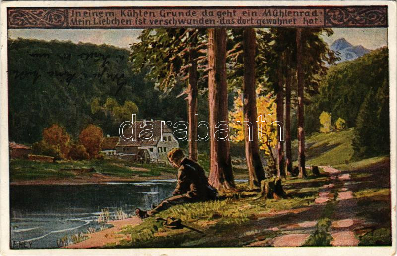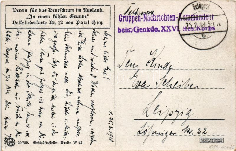 1918 'In einem Kühlen Grunde da geht ein Mühlenrad...' Verein für das Deutschtum im Ausland. Volksliederkarte Nr. 12. / German folklore + "Gruppen-Nachrichten-Kommandeur beim Genkdo. XXVI. Reg.Korbs" Feldpost s: Paul Hey