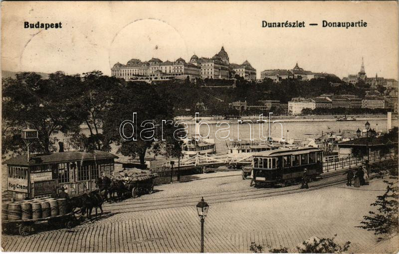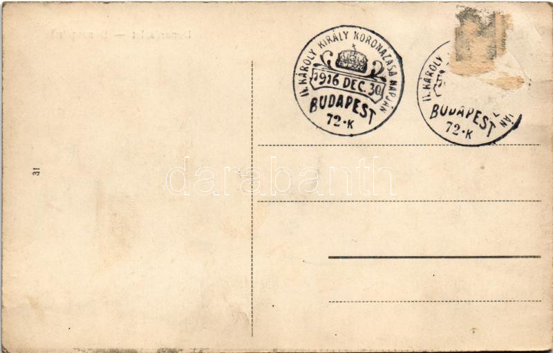 1916 Budapest V. Duna részlet, villamos, Királyi vár, Kalodont fogkrém reklám + "IV. Károly király koronázása napján 1916. dec. 30. Budapest" So. Stpl. (ragasztónyom / glue mark)