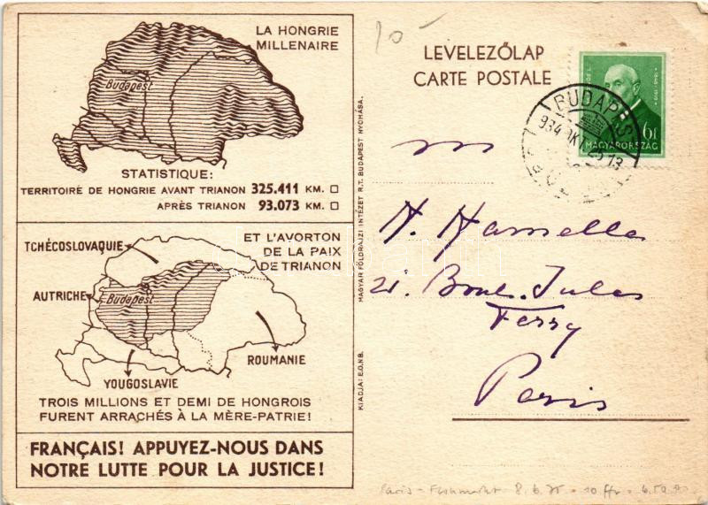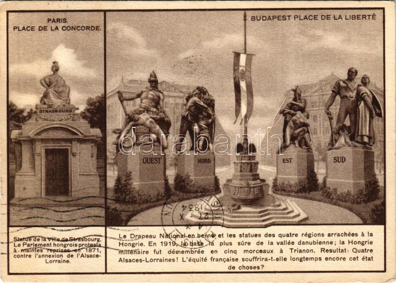 1934 Concorde tér Párizsban és a Szabadság tér Budapesten. Trianon irredenta szoborcsoport, Országzászló. Magyar Földrajzi Intézet rt. nyomása / Paris, Place de la Concorde - Budapest, Place de la Liberté; Hungarian irredenta propaganda, Trianon map on the backside (EK)