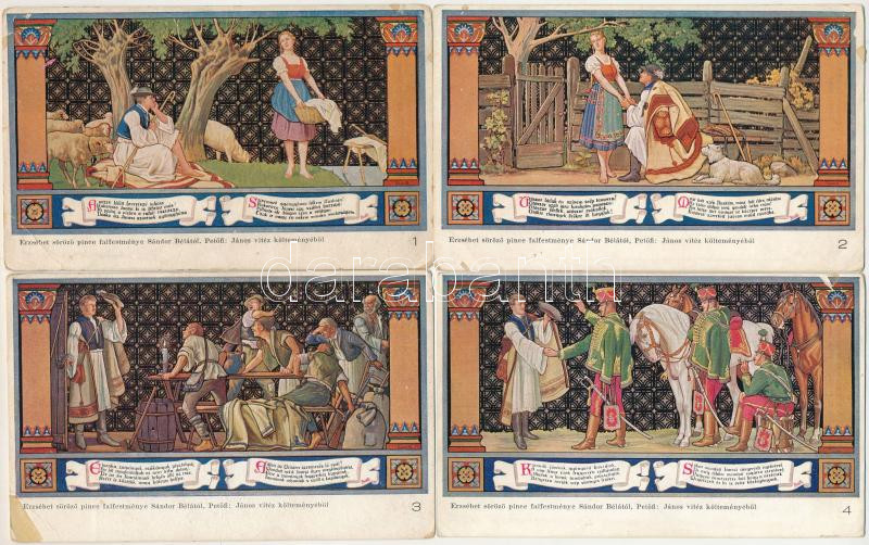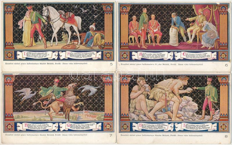 BUDAPEST - 12 db RÉGI képeslap: Egyetem utca 5. Erzsébet Királyné Szálló étterem és söröző pince, Sándor Béla falfestménye Petőfi Sándor János vitézéből, teljes sorozat / 12 pre 1945 wall paintings postcards, complete series