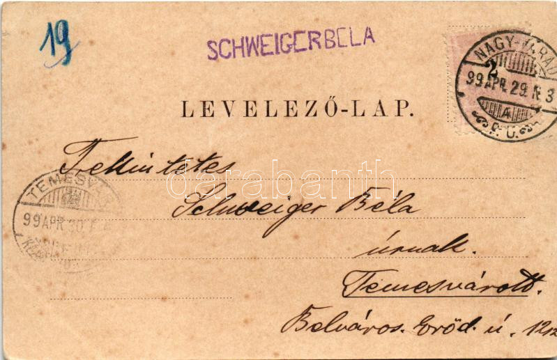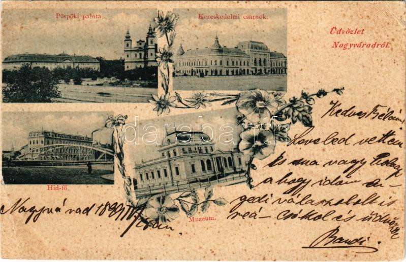 1899 Nagyvárad, Oradea; mozaiklap 4 képpel: Püspöki palota, Kereskedelmi csarnok, Hídfő, Múzeum / bishop's palace, trade hall, bridge, museum. Art Nouveau, floral (vágott / cut)