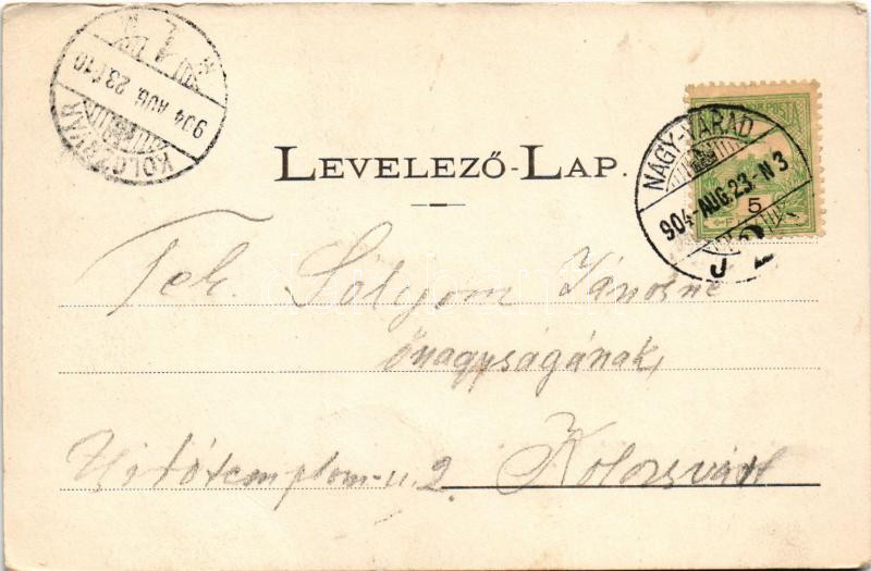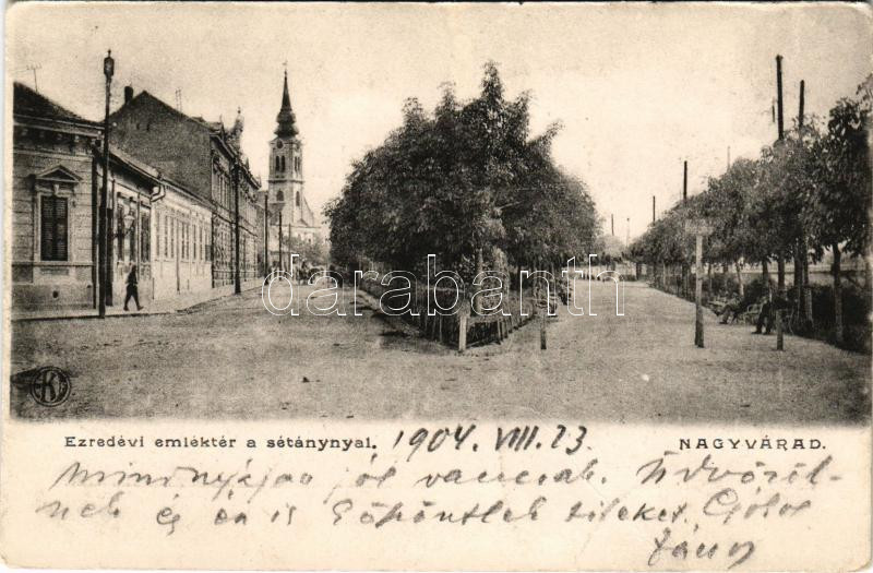 1904 Nagyvárad, Oradea; Ezredévi emléktér a sétánnyal, templom / square, promenade, church (fa)