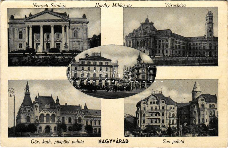 1943 Nagyvárad, Oradea; Nemzeti Színház, Horthy Miklós tér, Városháza, Görögkatolikus püspöki palota, Sas palota / theater, square, town hall, bishop's palace, palace, tenement house (EK)