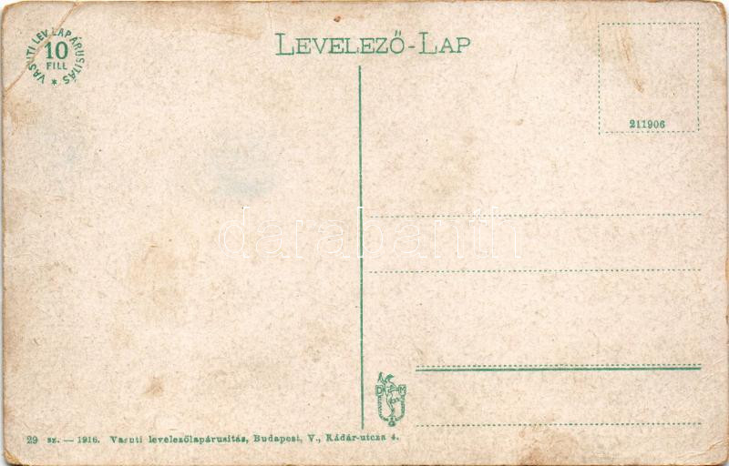 Szabadka, Subotica; Szent István tér, villamos, Földes Samu, Demeter és Fiai üzlete. Vasúti levelezőlapárusítás 29. sz. - 1916. / square, tram, shops (EM)