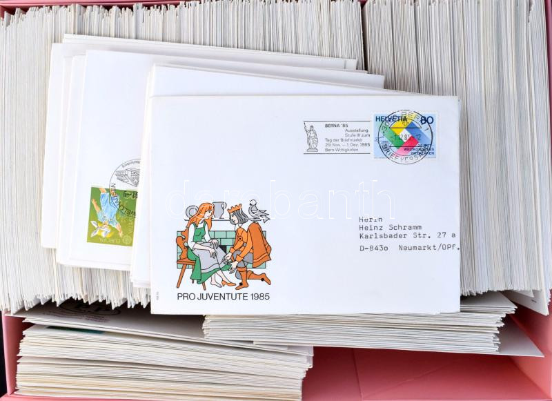 Svájc kb 500 db címezetlen küldemény, alkalmi / elsőnapi bélyegzésekkel, dobozban