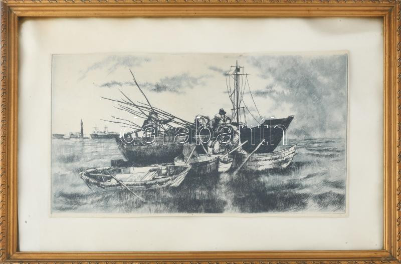 Olvashatatlan jelzéssel: Halászok. Rézkarc, papír, körbevágva, üvegezett fakeretben. 22,5x38,5 cm