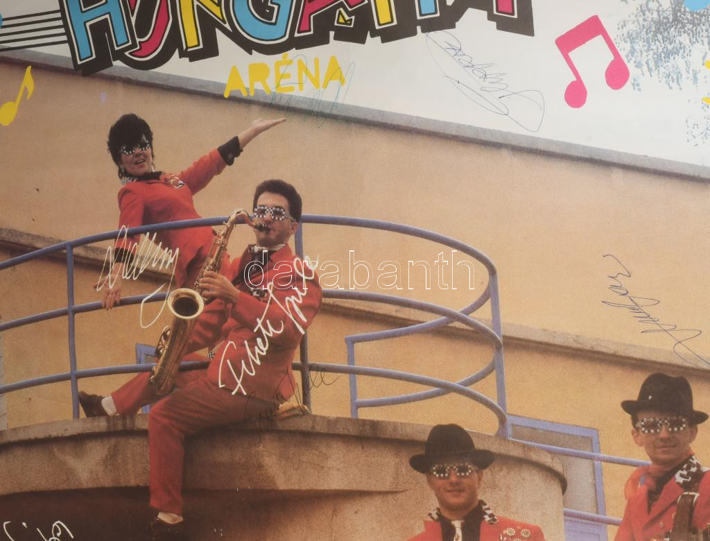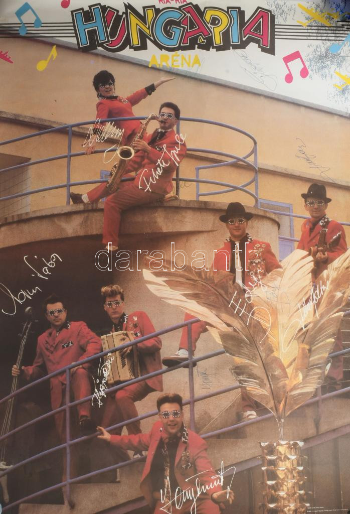 1983 A Hungária együttes tagjainak aláírásai plakáton: Flipper Öcsi (Jeszenszky Béla Tibor), Dolly (Penczi Mária Ilona), Fekete Gyula, Kékes Zoltán, Dedy (Zsoldos Gábor), Novai Gábor, Fenyő Miklós. Feltekerve, kis lapszéli szakadással, 96x67 cm