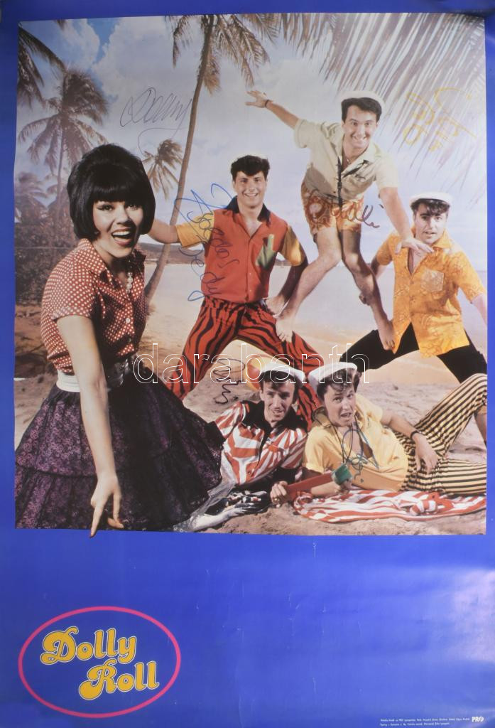 A Dolly Roll együttes tagjainak aláírásai plakáton: Dolly (Penczi Mária Ilona), Dedy (Zsoldos Gábor), Sziszi (Kékes Zoltán), Fekete Gyula, Novai Gábor, Flipper Öcsi (Jeszenszky Béla Tibor). Feltekerve, 97x68 cm