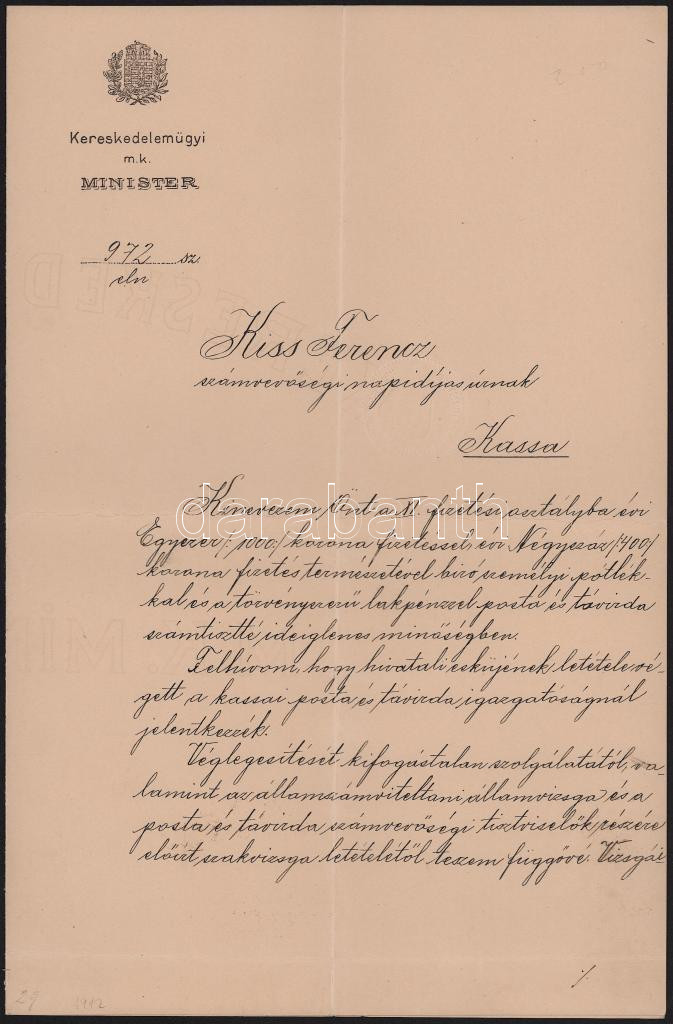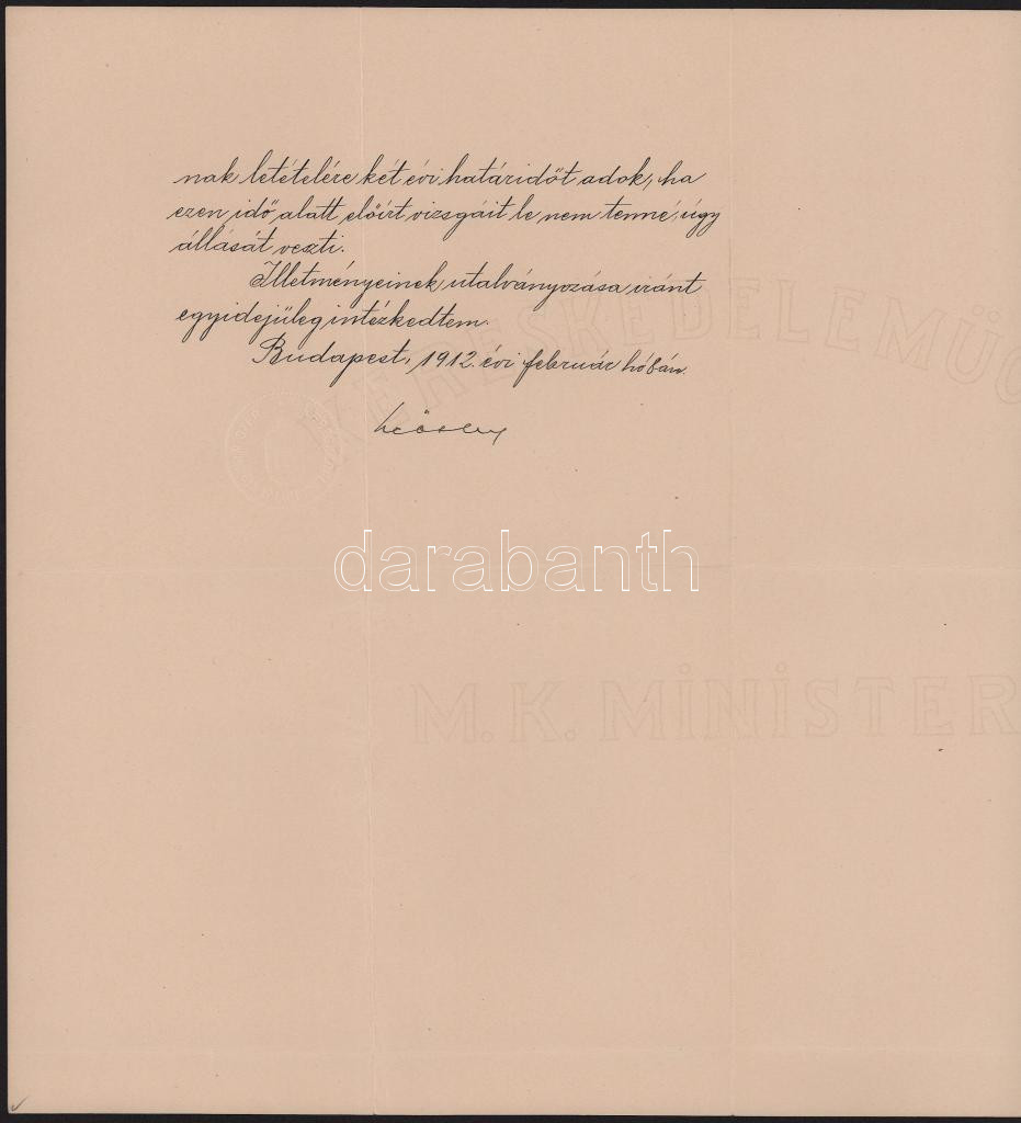 1912 Beöthy László (1860-1943) kereskedelmi minister, a Hitelbank alelnöke autográf aláírása számvevőszéki kinevezésen.