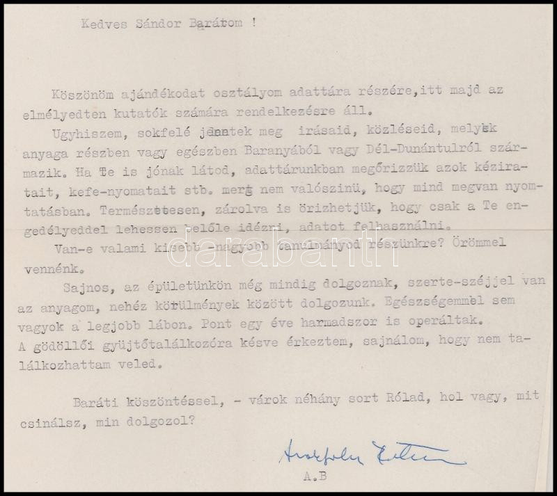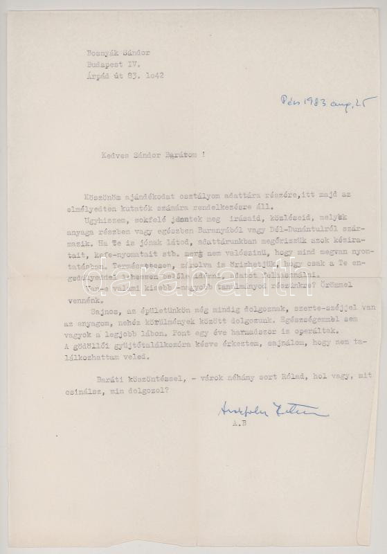 1989 Andrásfalvy Bertalan kultuszminiszter, művészettörténész levele Bosnyák Sándor Baranya kutatónak