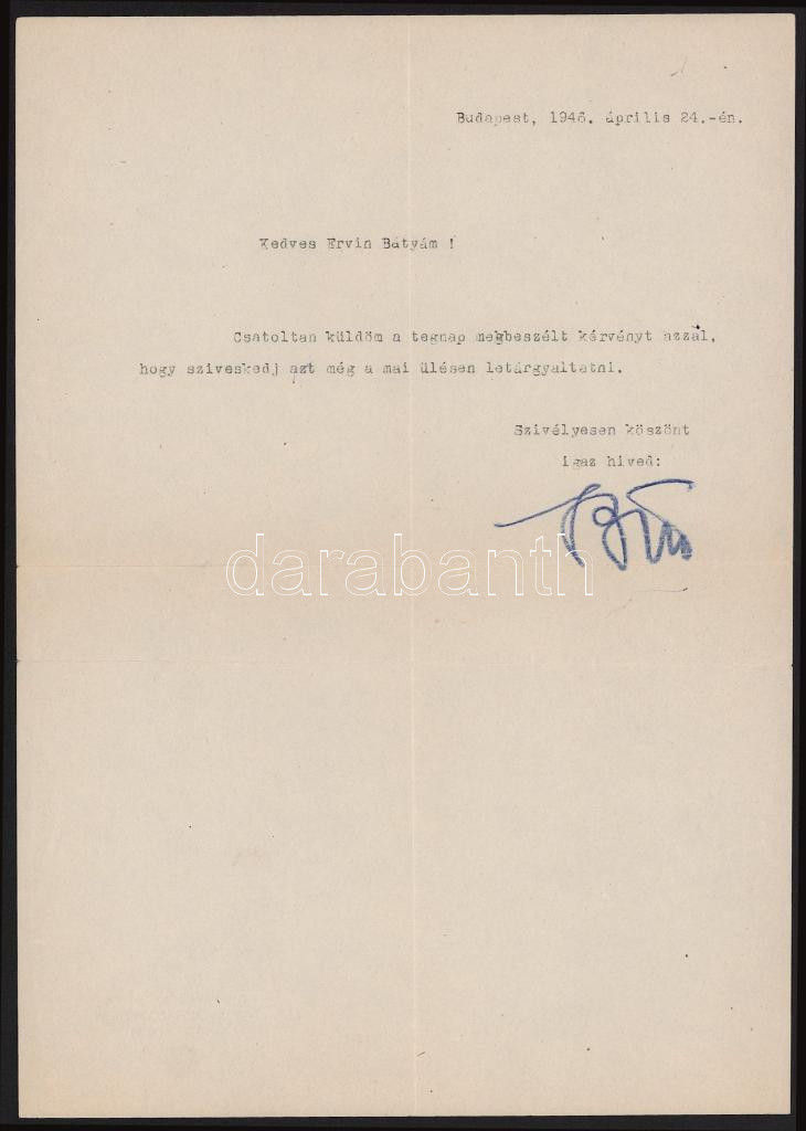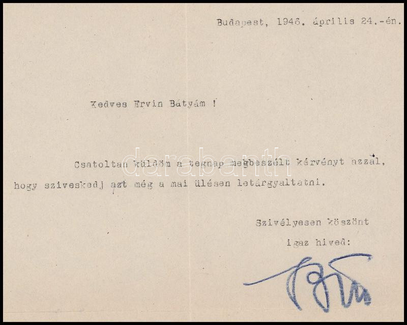 1946 Bán Antal (1903-1951) iparügyi miniszter autográf aláírása levélen