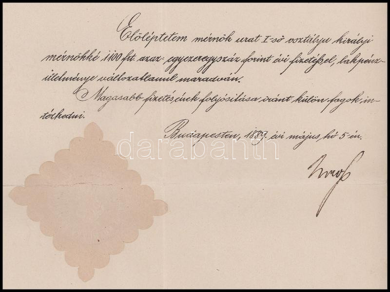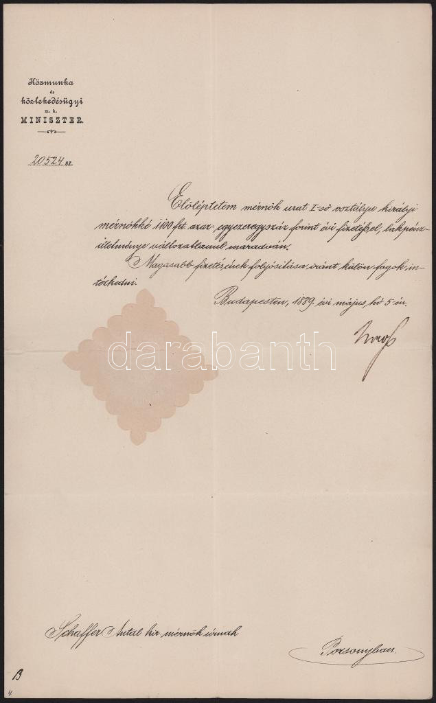 1889 Baross Gábor (1848-1892) közmunka és közlekedésügyi miniszter autográf aláírása mérnöknek szóló kinevezésen