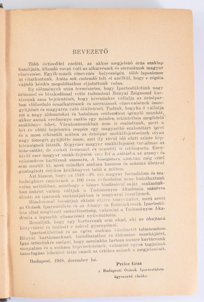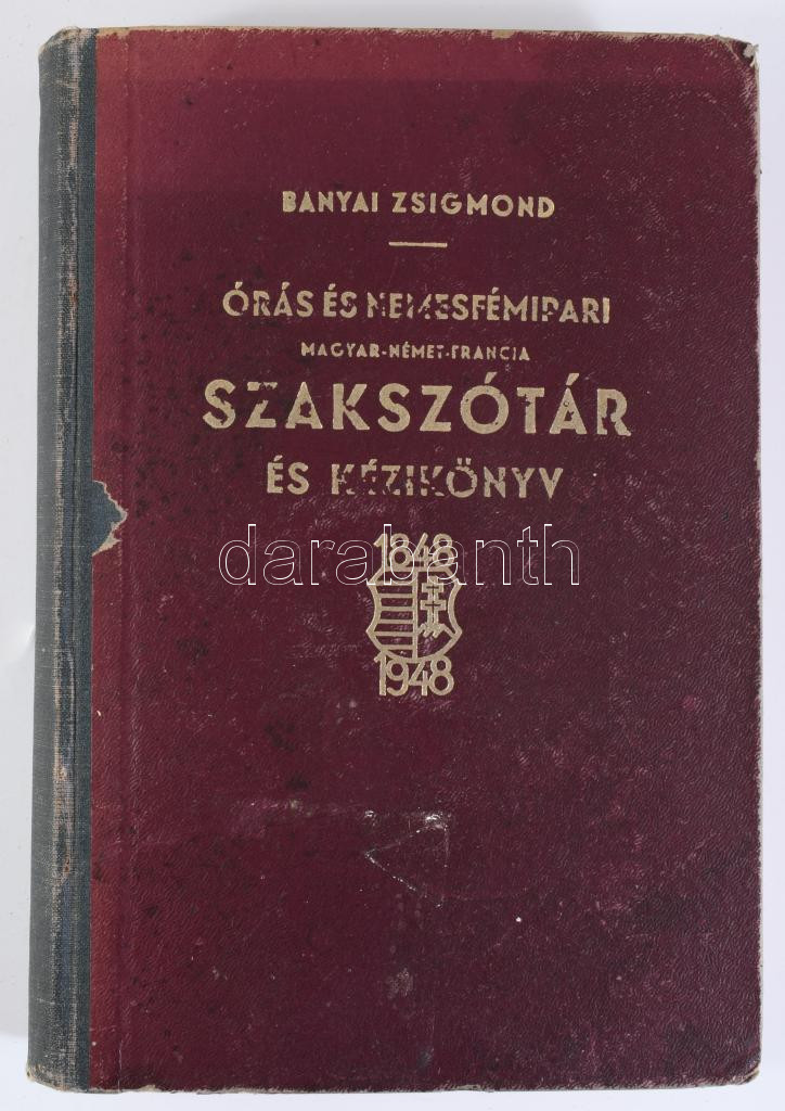 Bányai Zsigmond: Órás és nemesfémipari szakszótár és kézikönyv. I. Háromnyelvű órás szakszótár. Magyar-német-francia nyelven. II. Az órásmesterség kézikönyve. III. Nemesfémipari szakszótár és kézikönyv. Bp., 1948., Budapesti Órások Ipartestülete,(Karpinszky Aladár-ny.), 416+13 p. + 17 t. Kiadói félvászon-kötésben, kopott, foltos borítóval.