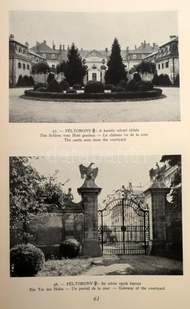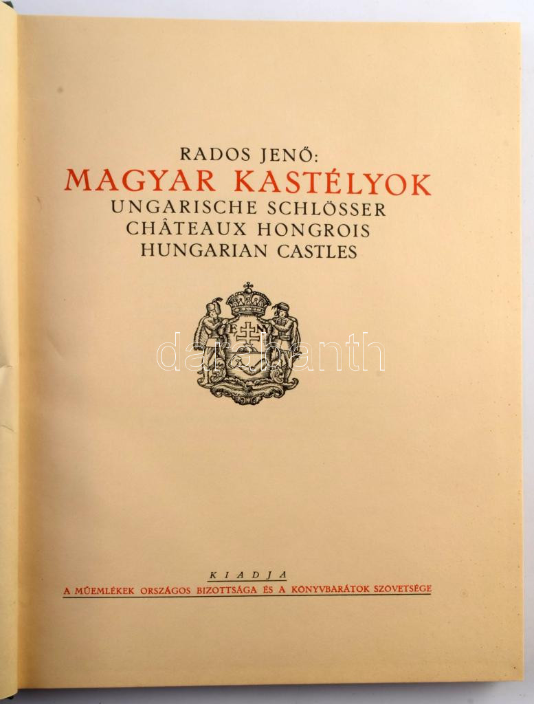 Rados Jenő: Magyar kastélyok. Ungarische Schlösser. Châteaux hongrois. Hungarian Castles. Bp., 1931, Műemlékek Országos Bizottsága - Könyvbarátok Szövetsége (Kir. M. Egyetemi Ny.), 238+[2] p. Első kiadás. Fekete-fehér képekkel illusztrálva. Kiadói egészvászon-kötés, kissé fakó gerinccel, egyébként jó állapotban.