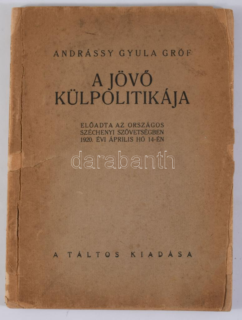 Andrássy Gyula, gróf: A jövő külpolitikája. Előadta az Országos Széchenyi Szövetségben 1920. évi április hó 14-én. (Bp., 1920), Táltos, (Apostol-ny.), 32 p. Első kiadás. Kiadói tűzött papírkötés, sérült borítóval és gerinccel.