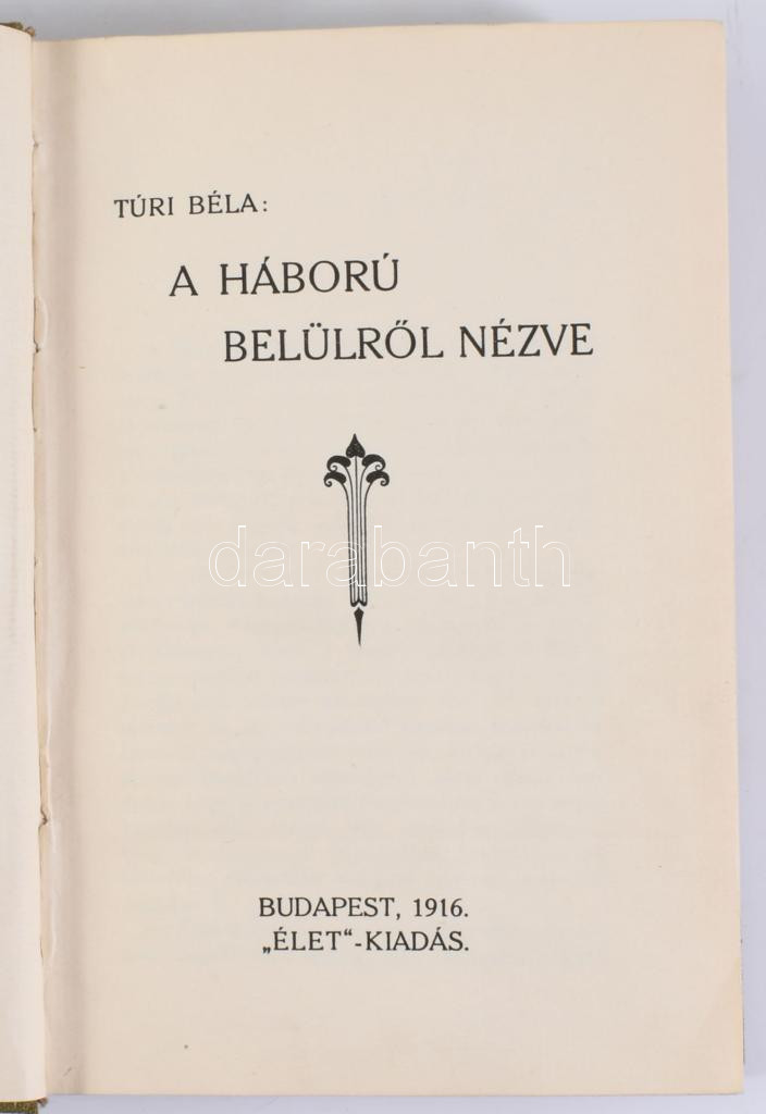 Túri Béla: A háború belülről nézve. Bp., 1916, "Élet", 290+6 p. Átkötött egészvászon-kötés, kissé kopott borítóval.