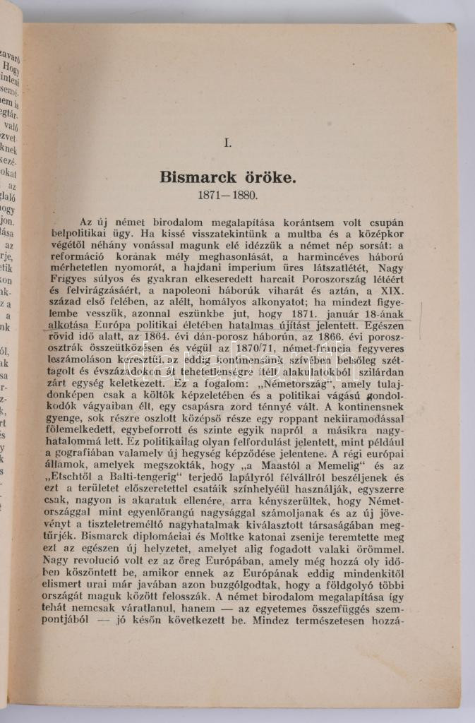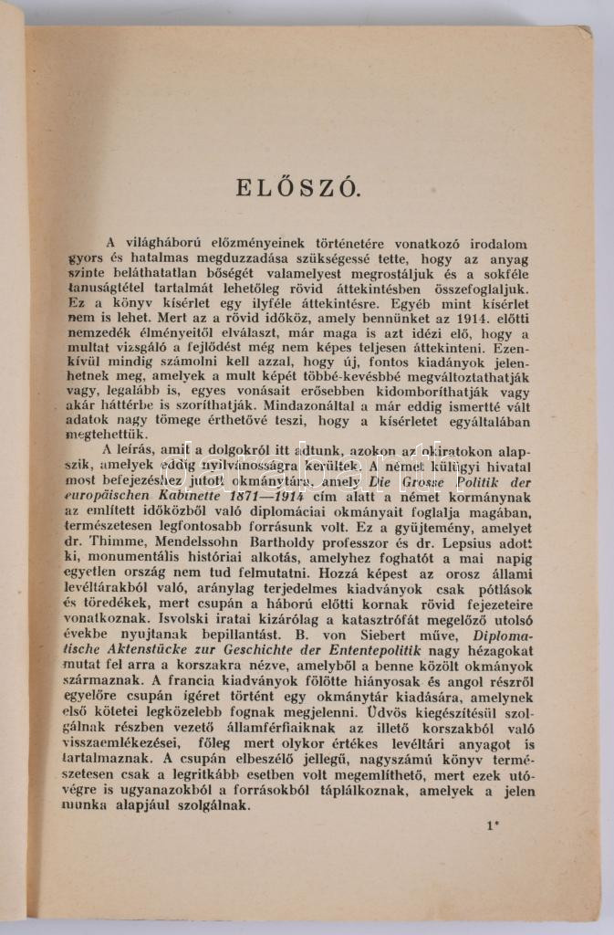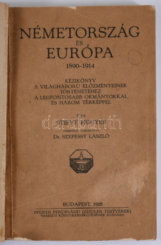 Stieve Frigyes: Németország és Európa 1890-1914. Kézikönyv a világháború előzményeinek történetéhez a legfontosabb okmányokkal. Ford.: Szepessy László. [Bp.], 1928, Pfeifer Ferdinánd (Zeidler Testvérek), (Hornyánszky Viktor-ny.), 199+1 p.+3 t. Az elülső papírborítót bekötötték. Átkötött papírkötés, aláhúzásokkal és bejelölésekkel, a térképek sérültek, kettő közülük kettészakadt.