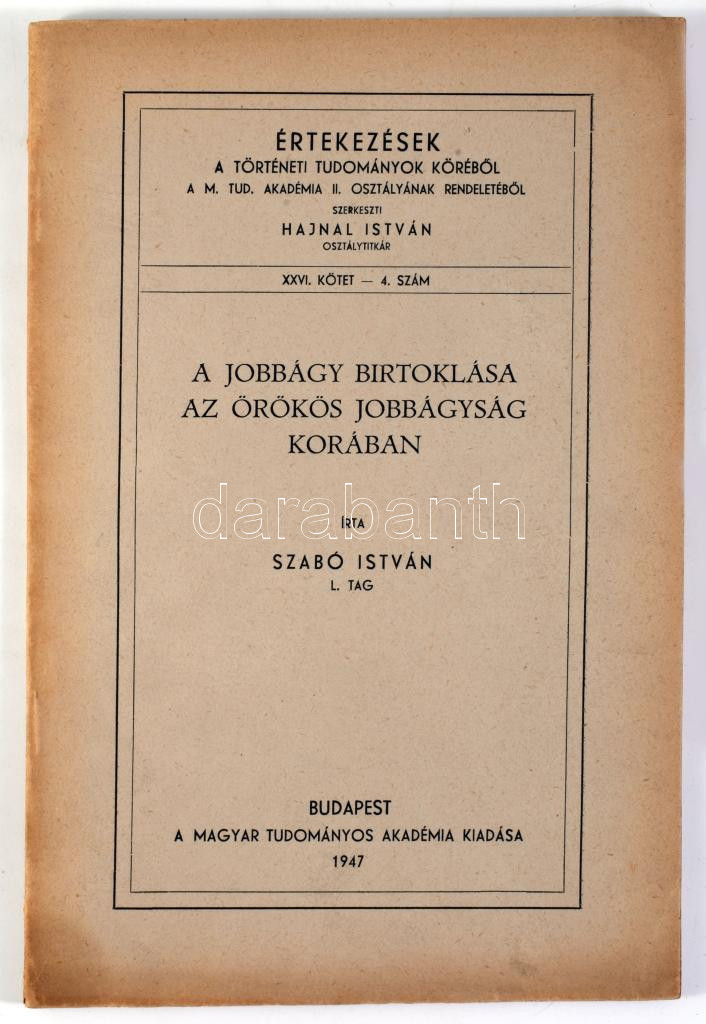 Szabó István: A jobbágy birtoklása az örökös jobbágyság korában. Értekezés a Történeti Tudományok Köréből. XVI. köt. 4. sz. Bp., 1947, MTA, 77 p. Kiadói papírkötés.