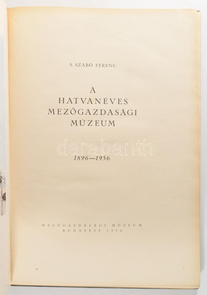 S. Szabó Ferenc: A hatvanéves Mezőgazdasági Múzeum. 1896-1956. Bp., 1956, Mezőgazdasági Múzeum, 242+[2] p.+ 4 t. Fekete-fehér képekkel illusztrálva. Kiadói egészvászon-kötés, kissé fakó gerinccel. Megjelent 1100 példányban.